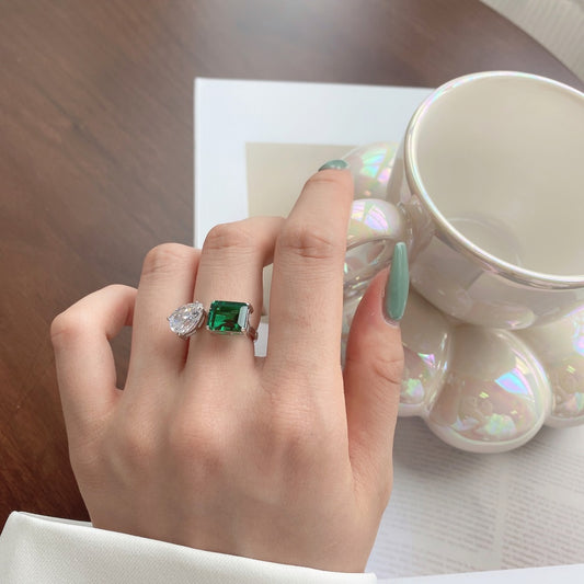 Adjustable Emerald Princess Cut You and Me Rhodium-Plated Ring